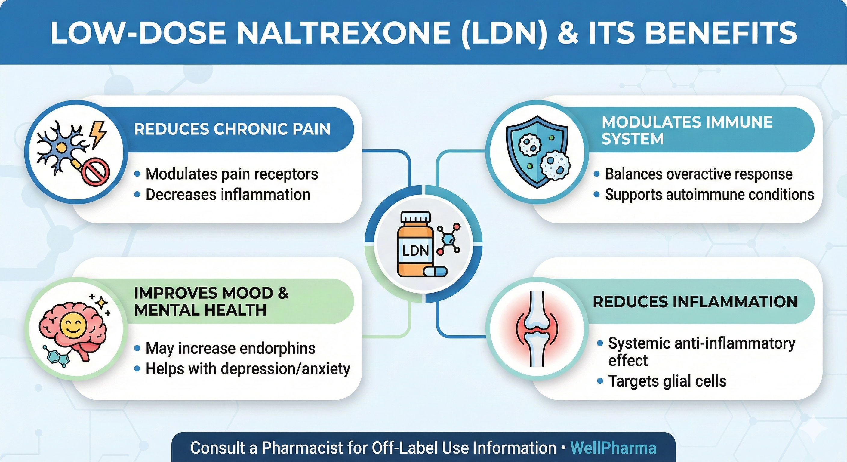 This information is for educational purposes only and does not constitute medical advice. Always consult with your healthcare provider about medications and treatments appropriate for your individual needs. Low-dose naltrexone is used off-label for the conditions discussed and has not been FDA-approved for these uses.